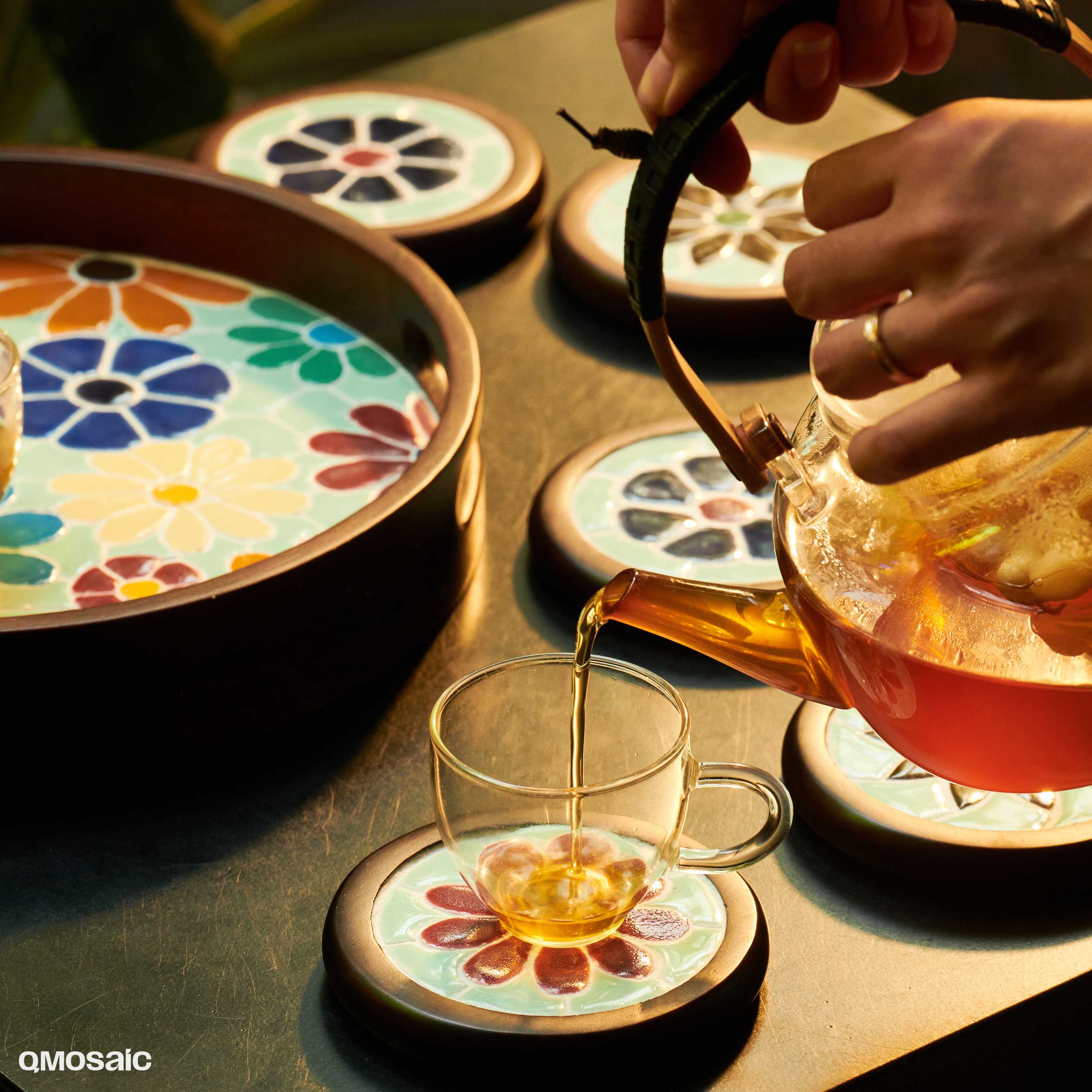 Tựa như một lát cắt ký ức được nâng niu qua đôi tay người nghệ nhân, chiếc khay gợi mở một câu chuyện nghệ thuật được kể bằng gốm. Mỗi mảnh nhỏ trên bề mặt đều là kết quả của quá trình chọn lọc kỹ lưỡng, cắt ghép tỉ mỉ và được nung ở nhiệt độ hơn 1200°C – nơi đất, lửa và tâm huyết gặp nhau để tạo nên một lớp men bóng mịn và bền chắc và trường tồn với thời gian. Đó không chỉ là một sản phẩm thủ công, mà là sự kết tinh của đôi bàn tay khéo léo, sự kiên nhẫn và tình yêu với cái đẹp.